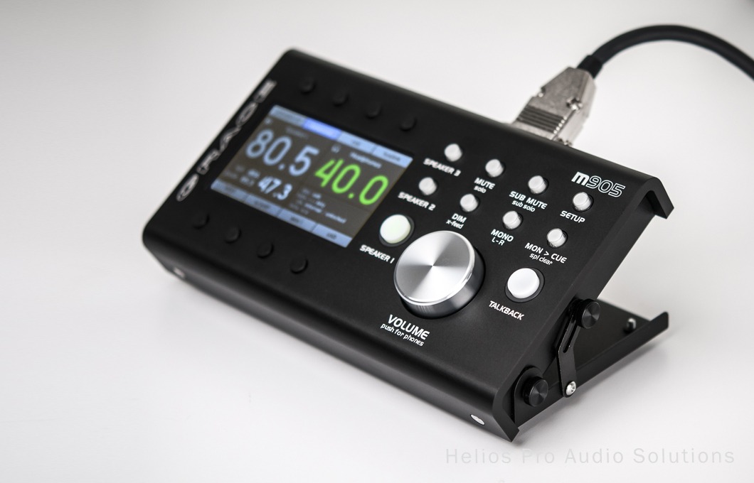 The m905 has been engineered from the ground up to provide unrivaled audio performance, with a powerful, comprehensive, and intuitive feature set. The main audio and power supply circuitry is housed in a 2U rack mount mainframe, while system control is managed by a sleek new ergonomic desktop remote control unit (RCU). The RCU is a combination of dedicated hardware and a color, graphical LCD. The primary monitoring features are accessed via hardware switches and a rotary encoder. All system information is presented on the LCD and illuminated switches. This hybrid design provides the solid feel and function of traditional hardware, with the added power and flexibility of a graphical user interface.